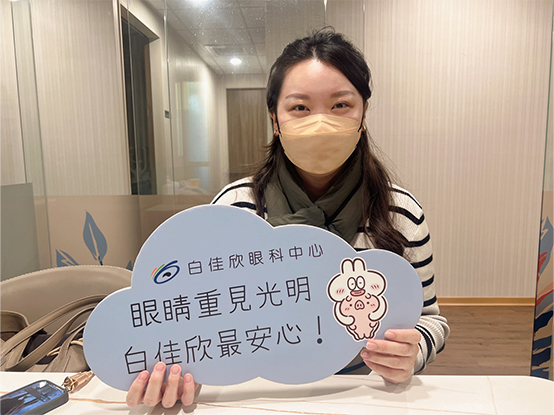 從小戴眼鏡、到換成隱形眼鏡已經超過10年,直到今年戴隱形眼鏡不再舒服,乾眼導致無法長時間配戴,才開始考慮雷射手術。原本看身邊很多朋友做的是SMILE,妹妹也是給白醫師做的SMILE,但由於我的度數較高的關係,只能做LASIK或ICL,經過諮詢後我選擇LASIK。 手術過程比想像中還不恐怖,很感謝白醫師讓我脫離眼鏡人生,術後隔天已經恢復良好,沒有任何不適,推薦深度近視的人來白佳欣!
