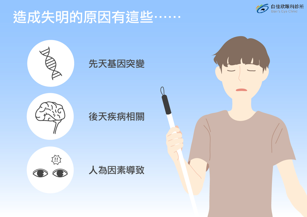 白佳欣院長表示,有些疾病若未經妥善治療,隨著病情發展、惡化的確有可能演變成失明,如青光眼、白內障及糖尿病等疾病,而這三種疾病分別影響視神經、水晶體即視網膜。然而,無論是哪種近視雷射皆於角膜施作,並不會直接接觸到水晶體、視網膜,換句話說,近視雷射與失明並無直接相關。