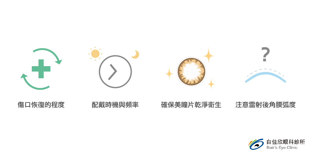有些人因職業關係,雷射後仍有配戴美瞳片的需求,但是聽說做完近視雷射術後再也不能戴美瞳片,進而影響施作意願。白佳欣院長表示,有配戴美瞳片的需求的患者,術後是可以繼續配戴美瞳片的,但要注意四個關鍵: