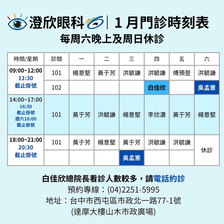 澄欣眼科 1 月門診時間出爐,歡迎提前安排看診